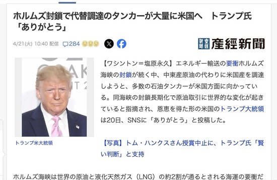 ホルムズ海峡封鎖で代替調達のタンカーが大量に米国へ トランプ大統領「ありがとう」