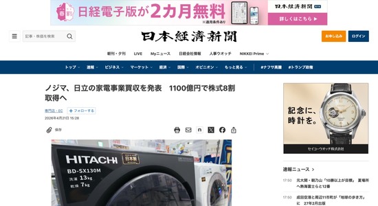 【経済】ノジマ、日立の家電事業買収を発表 1100億円で株式8割取得へ