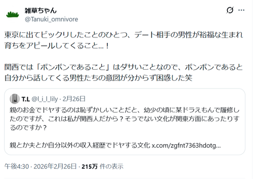 【悲報】関西人「東京人、実家の太さ自慢する男多すぎ。関西だとボンボンはダサいよ?」→Xで大激論にwwww