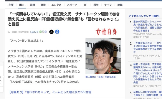 堀江貴文さん、サナエトークン騒動で巻き添え炎上に猛反論「一切関与していない!」「言わされちゃって」「スーパー貰い事故だよ!」