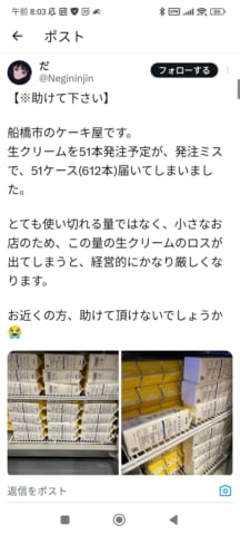 【悲報】船橋のケーキ屋さん、生クリーム51本発注予定が612本届いてしまうwwwww