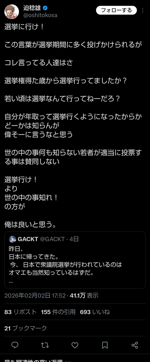 【悲報】有名漫画家「選挙に行け!って言ってる奴ら、若い頃選挙行ってないくせに偉そうなこと言うな!」→炎上wwww