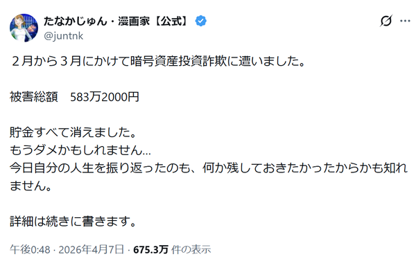漫画家・たなかじゅん氏「暗号資産投資詐欺」に遭ったと報告 「貯金すべて消えました。返ってくることは絶望的」