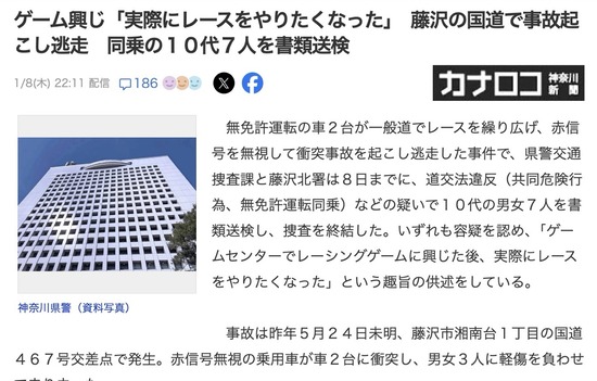 【神奈川】「ゲームで遊んだら実際にレースをやりたくなった」公道レースで事故を起こした男女7人逮捕 時速100km信号無視45km走行