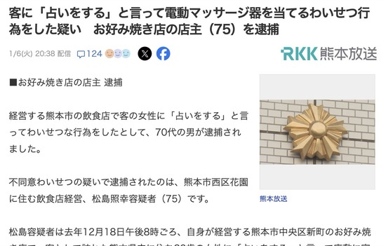 【熊本】お好み焼き屋さん、無料の電動マッサージ占いを披露して逮捕