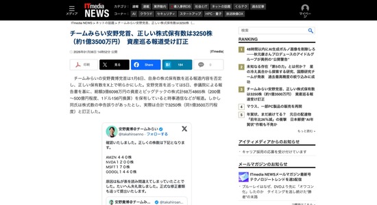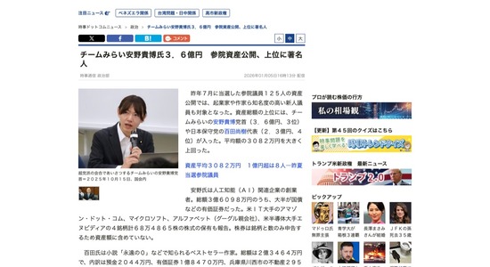 チームみらい安野貴博議員、資産300億円くらいあると判明wwww