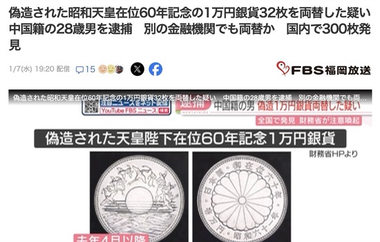 中国籍の男、昭和天皇在位60年記念銀貨を偽造、両替した疑いで逮捕