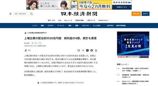 上場企業の配当金、初の20兆円超 純利益の4割に