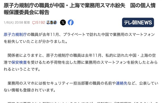 【悲報】中国観光に行った原子力規制庁の職員、業務用のスマートフォンを中国にて紛失