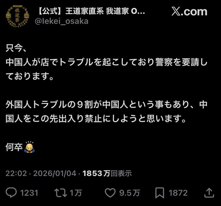 ラーメン屋「中国人は出禁にするぞ」X民「お前の店二重価格やんけ」←なぜか大炎上