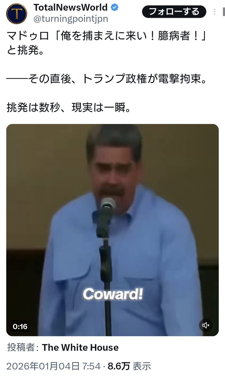 ベネズエラのマドゥロ大統領「トランプ!俺を捕まえに来い!臆病者!」と挑発していた