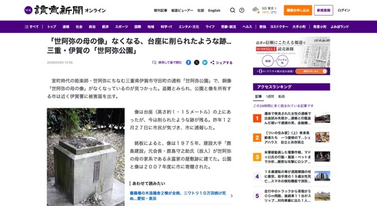 【三重】伊賀の公園から「世阿弥の母の銅像」なくなる 台座には削られたような跡