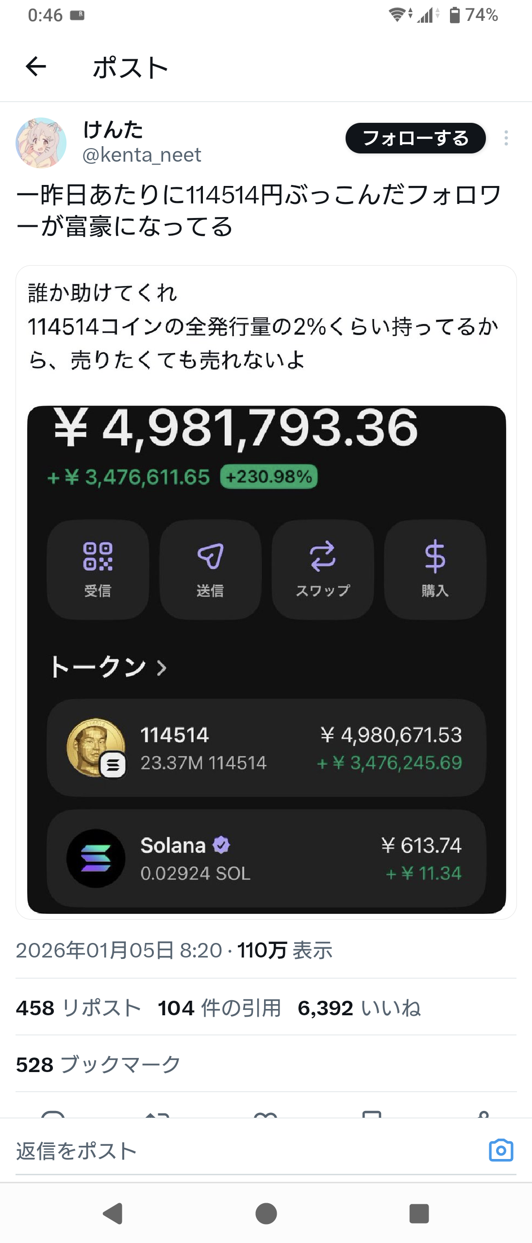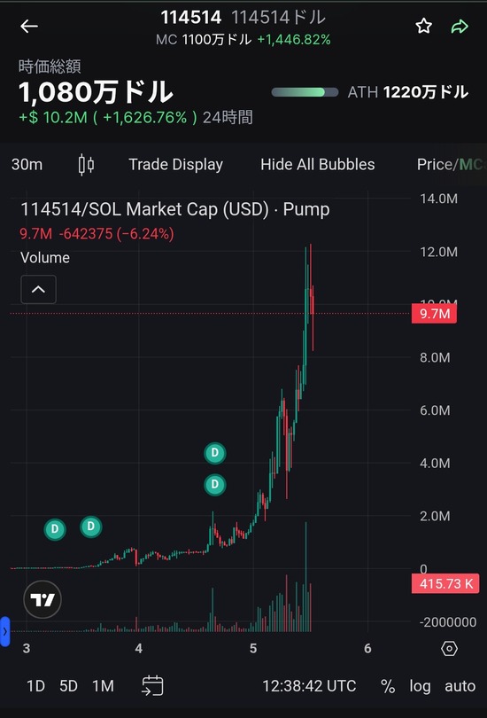 114514コインを1週間前に5万円分買った淫夢民、2000倍上昇して億り人になる