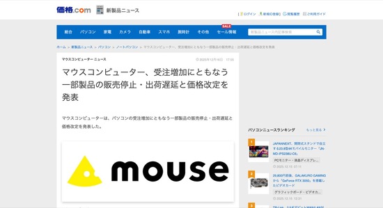 【悲報】マウスコンピューター「すまん、パーツないからパソコン作れん」販売停止・出荷遅延と価格改定へ