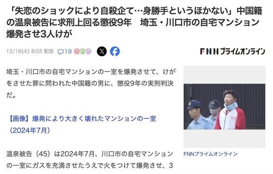 川口市のマンションを爆破した温泉に求刑上回る懲役9年判決