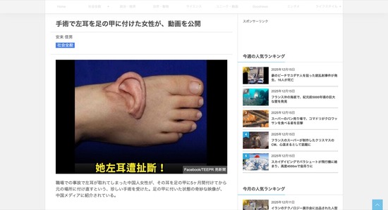【中国】工場事故で左耳が取れた女性、すぐに手術できなかったので足の甲に付けて5ヶ月過ごす