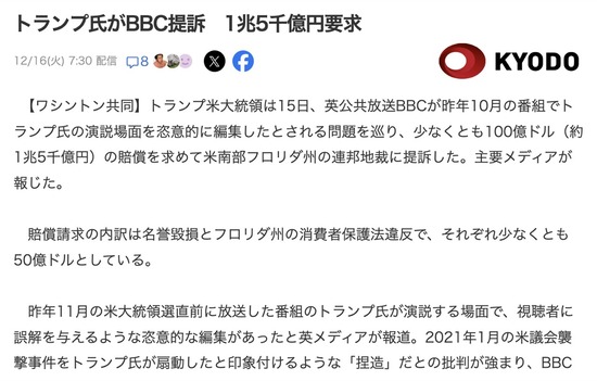 トランプ大統領、BBCを提訴「約1兆5千億円払え」