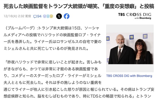 トランプ大統領、殺害された映画監督ロブ・ライナー氏を嘲笑「重度の妄想癖」「原因はトランプ妄想症候群」