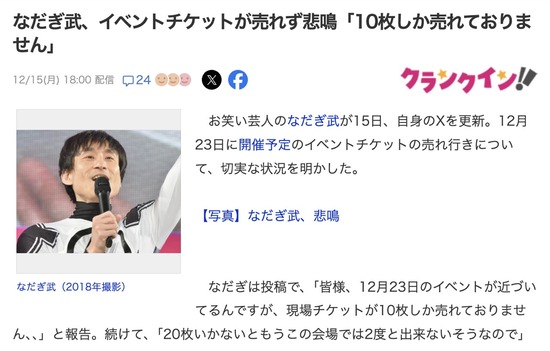 なだぎ武さん、イベントチケットが売れず悲鳴「10枚しか売れておりません」