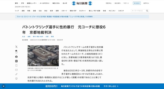 【京都地裁】バトントワリング男子選手に性的暴行 元男性コーチに懲役6年の実刑判決