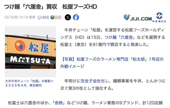 【外食】松屋フーズHD、つけ麺「六厘舎」を買収