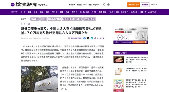 相次いだ証券口座乗っ取り事件、相場操縦容疑で中国人二人を逮捕