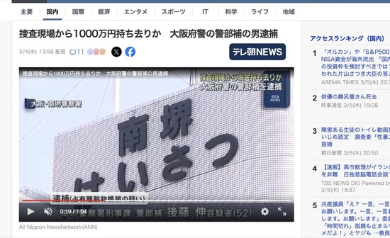 大阪府警の刑事さん、孤独死老人宅から1000万円をネコババして逮捕