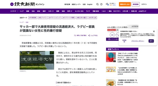 【悲報】流通経済大学、サッカー部は大麻使用、ラグビー部は通りすがりの女性を暴行