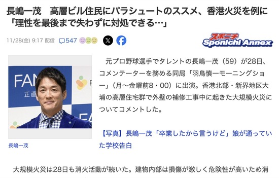 長嶋一茂さん「タワマンが火事ならパラシュートを使えばいいじゃない」