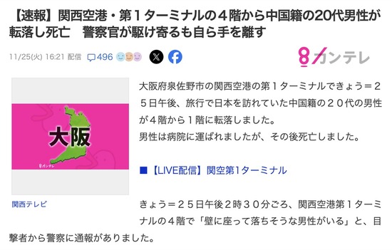 中国人、関西空港で飛び降りて死亡