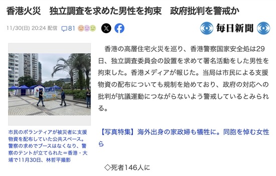香港警察、高層住宅火災の調査委員会設置を求めた男を拘束