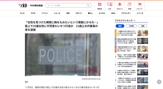 【福岡】「女性を見つけた瞬間に揉みたいという衝動にかられた」路上で女性に不同意わいせつをした21歳土木作業員を逮捕