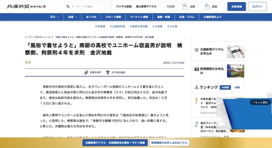 【金沢地裁】「風俗嬢に着せようと思った」無職、高校女子バレーボール部のユニホームを窃盗