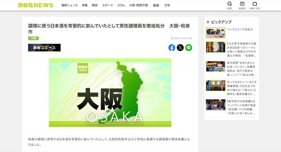【大阪】小学校に勤務するキッチンドランカーの調理員さん、勝手に料理酒を飲みまくって懲戒免職