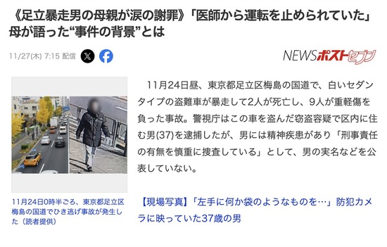 足立区暴走ひき逃げ犯の母「職場でイジメられて無職になった、病院と薬変えたのが良くなかったのかも」