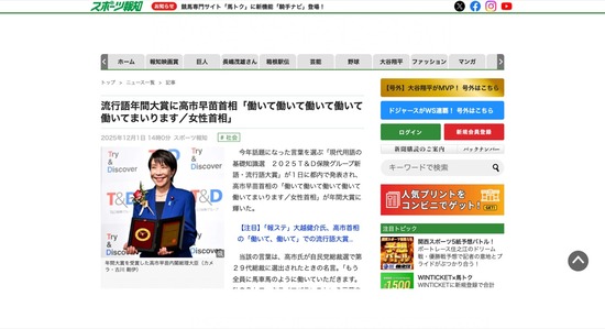流行語年間大賞に高市早苗首相「働いて働いて働いて働いて働いてまいります/女性首相」