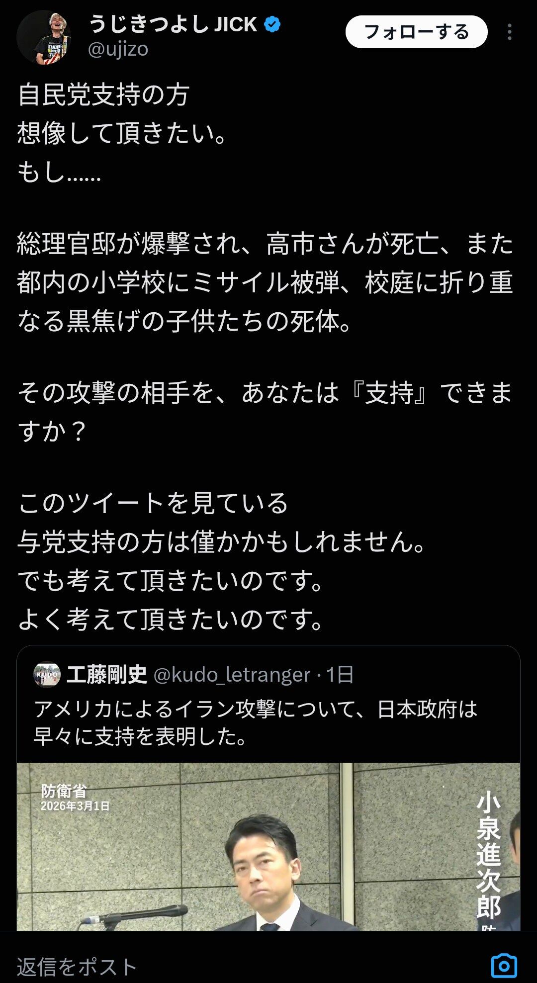 【悲報】うじきつよしさん「高市さんや子供たちが殺されても攻撃相手を支持できますか?」