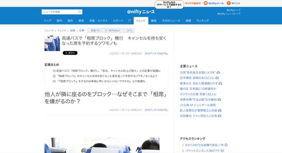 【悲報】夜行バスの相席ブロックブロック、流行り始める