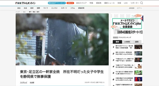足立区で一軒家全焼、所在不明だった女子中学生を静岡県で無事保護