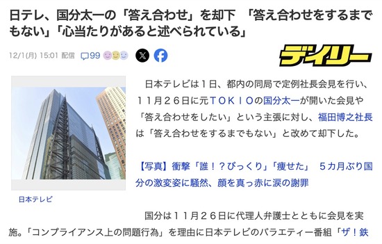 日テレ、国分太一の「答え合わせ」を却下 「答え合わせをするまでもない」「心当たりがあると述べられている」