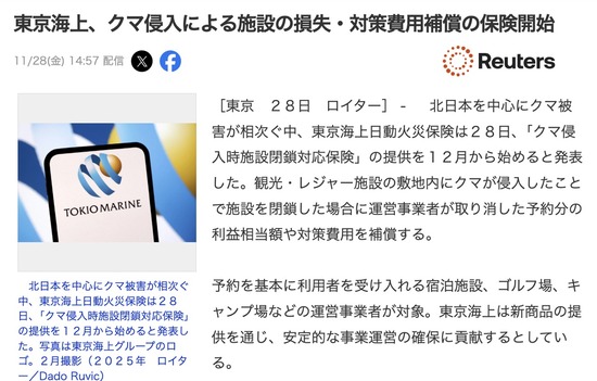 東京海上日動、クマ侵入による施設の損失・対策費用補償の保険取り扱い開始