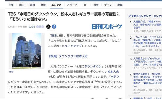 TBS「水曜日のダウンタウン」、松本人志レギュラー復帰の可能性について「総合的な状況によって都度都度、判断していく」
