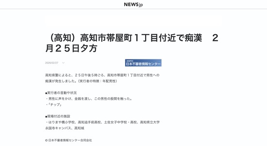 【高知】通りすがりの男性の股間を触りチップを渡す老紳士が発生