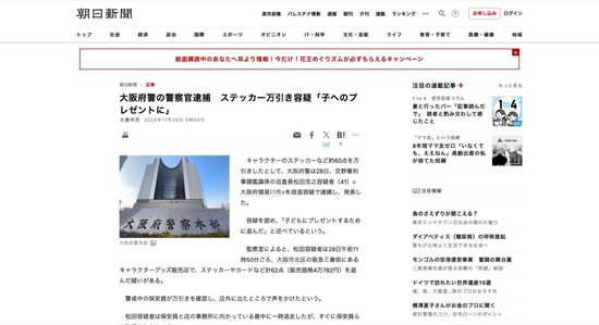 「子へのプレゼントに」大阪府警の警察官、ステッカー等約60点を万引き