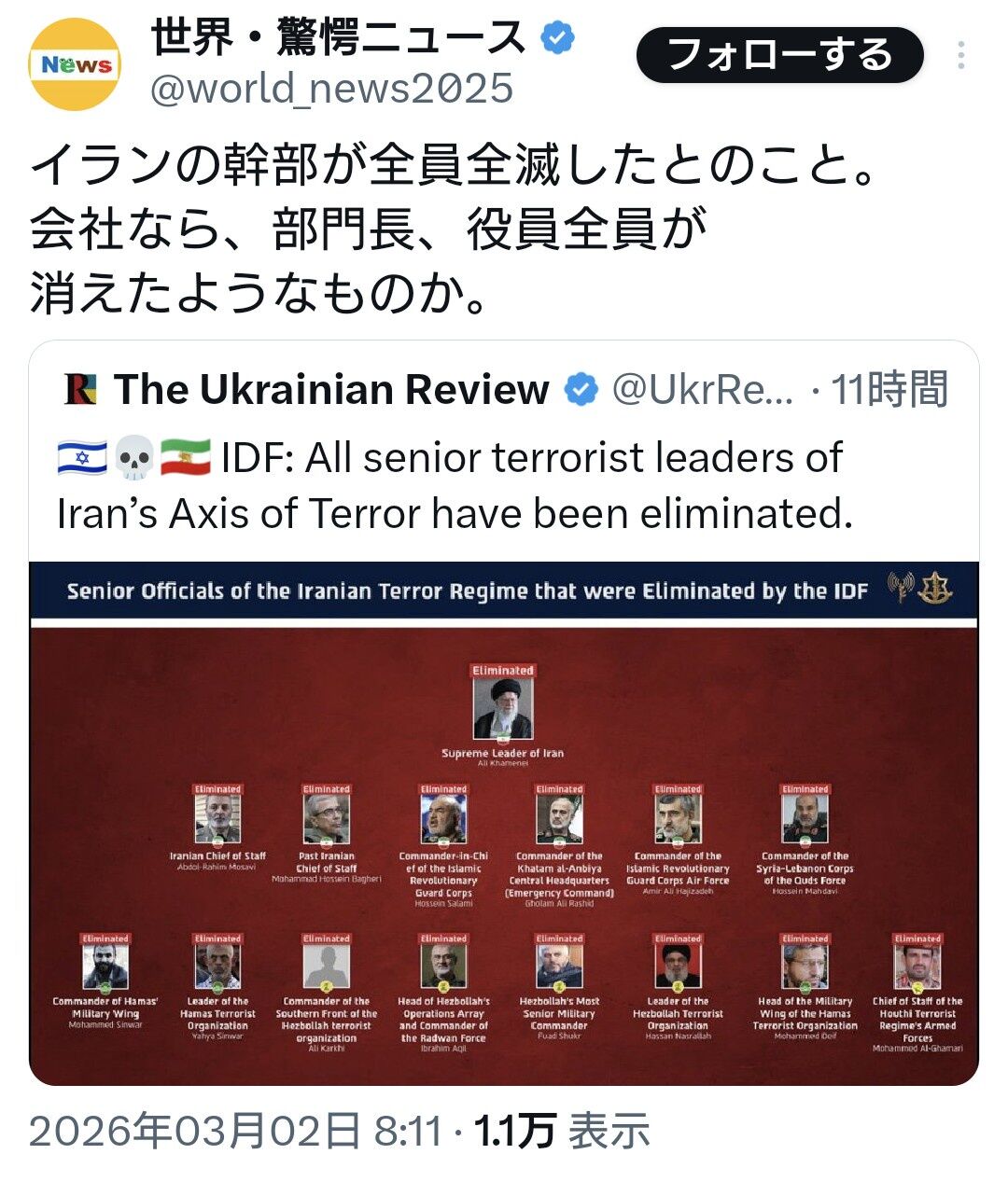 トランプ大統領「イランの幹部をごっそりまとめて全員全滅させといたわ」