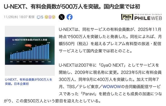 U-NEXT、有料会員数500万人突破