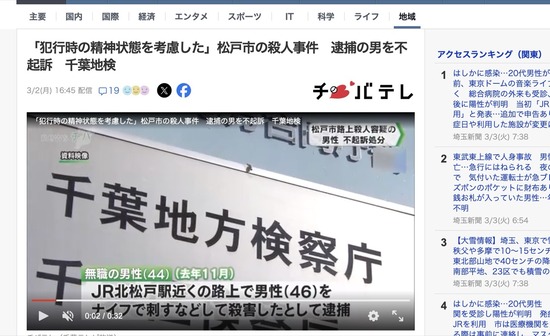 【千葉】面識のない男性をナイフで刺して殺害した容疑者、不起訴処分 検察「犯行時の精神状態を考慮した」