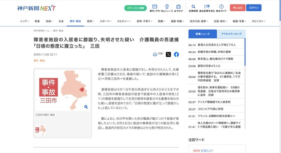 障害者施設の入居者に膝蹴り、失明させた介護職員を逮捕「日頃の態度に腹立った」