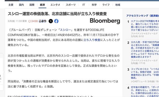 【経済】スシロー株価急落、寄生虫問題で北京店舗に当局が立ち入り検査
