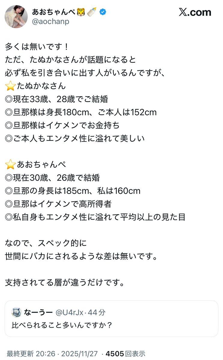 【闇深】あおちゃんぺさん、なぜか突然たぬかなに旦那スペックマウントをとりまくって精神的に勝利してしまい炎上